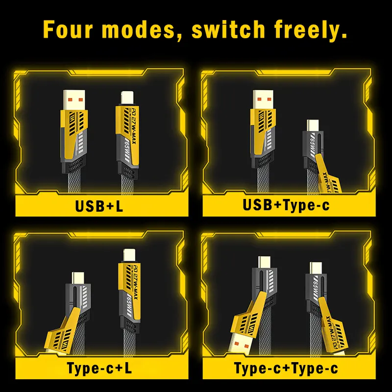 Acest cablu de încărcare 4 în 1 USB-C de 65W este soluția perfectă pentru toate nevoile tale de încărcare. Datorită conectorilor interschimbabili, poți încărca rapid și eficient o gamă variată de dispozitive: telefoane, tablete, laptopuri și multe altele. Designul său inteligent include porturi USB-C, micro-USB și Lightning, oferindu-ți flexibilitate maximă, eliminând nevoia de a transporta mai multe cabluri.