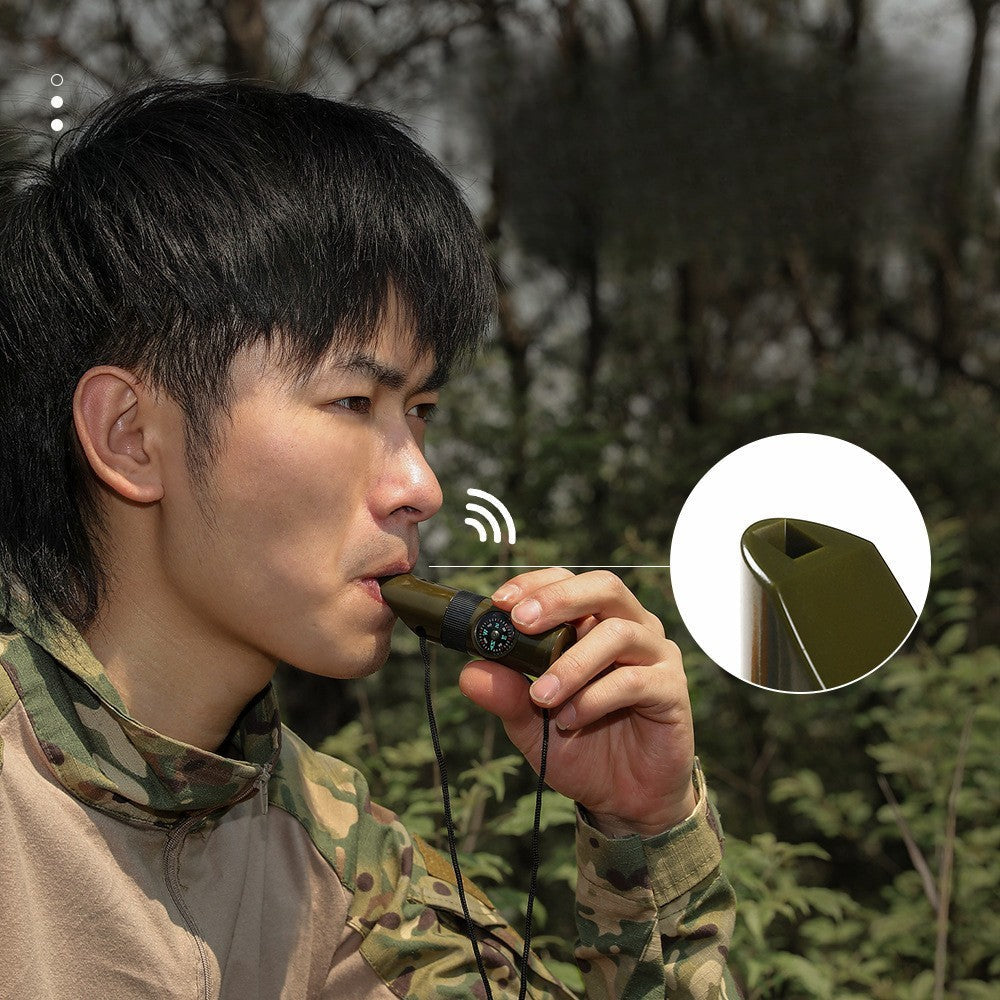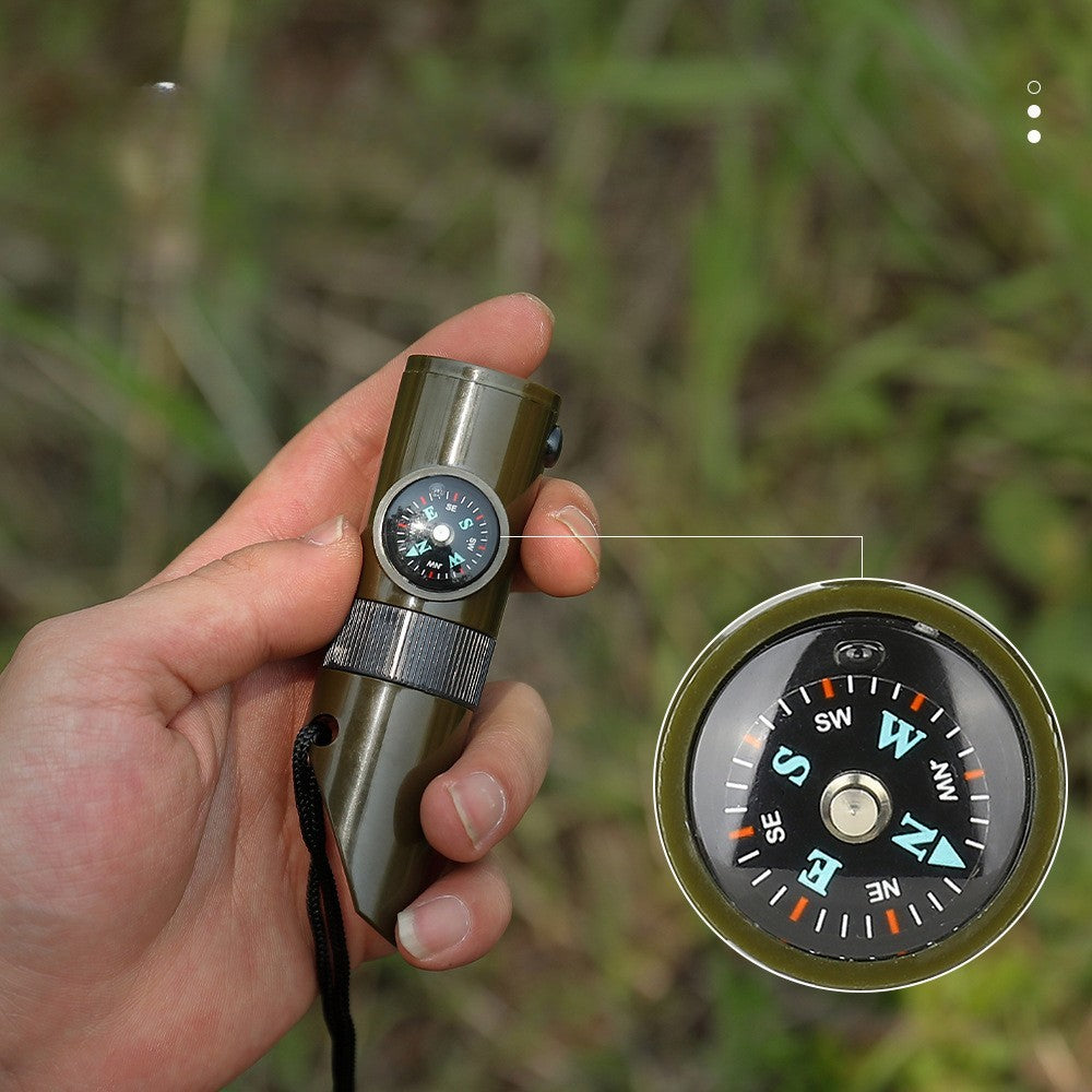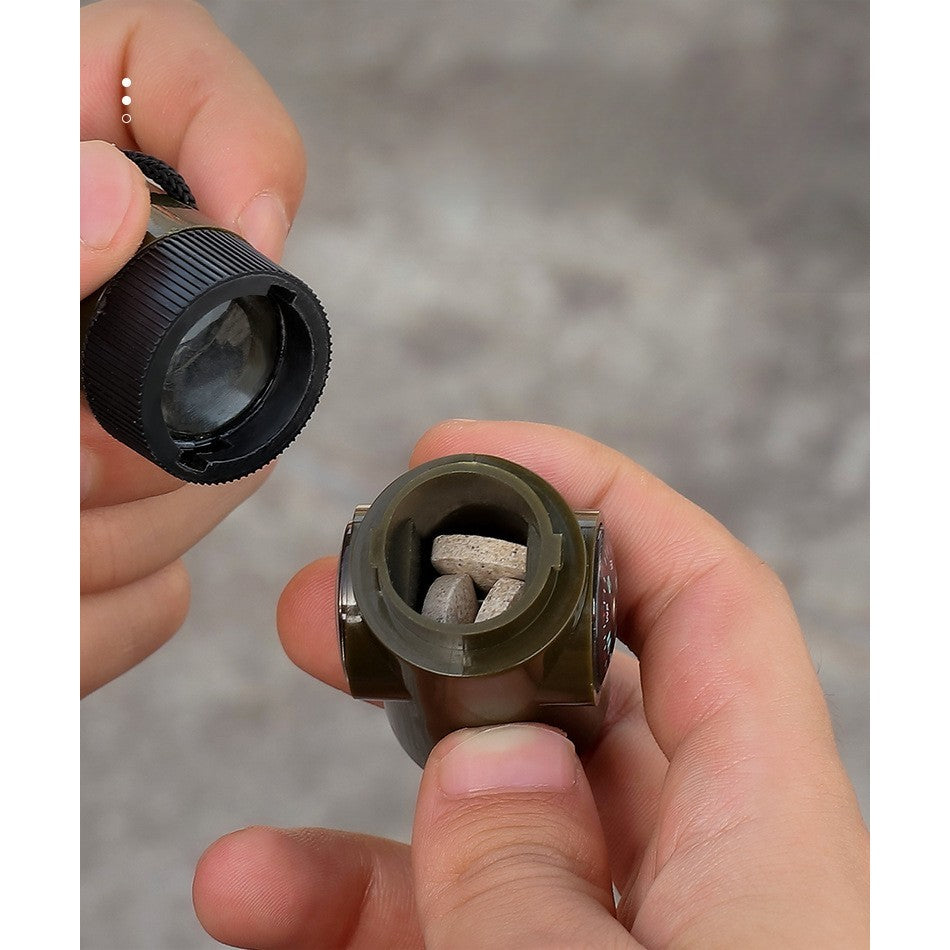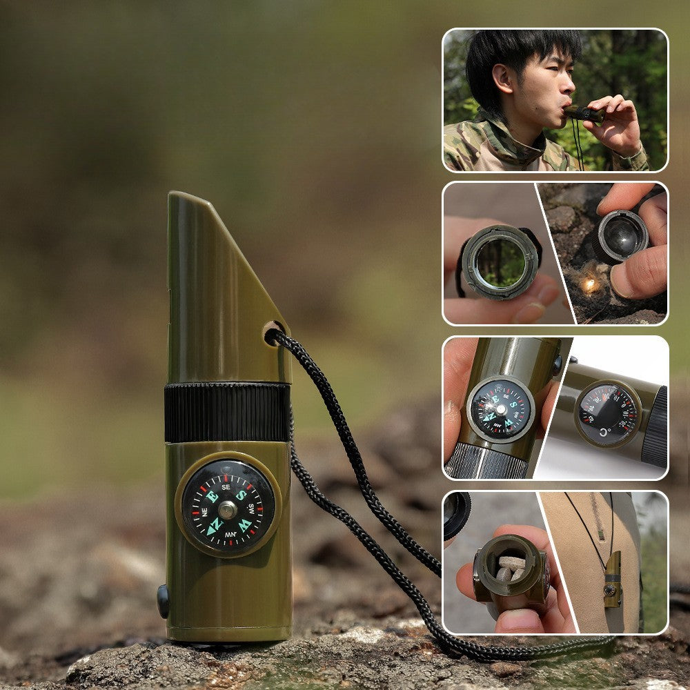 Kit supraviețuire 7‑în‑1 pentru drumeții – fluier, busolă, lupă, termometru, dozator pastile