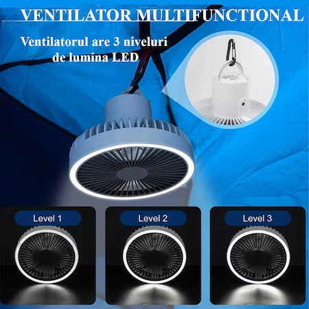 Освен това вентилаторът има 3 нива на светене, което го прави полезен дори през нощта. Те могат да се използват за осветяване на палатката или пространството около нея, като осигуряват практичен и ефективен източник на светлина при условия на слаба осветеност.