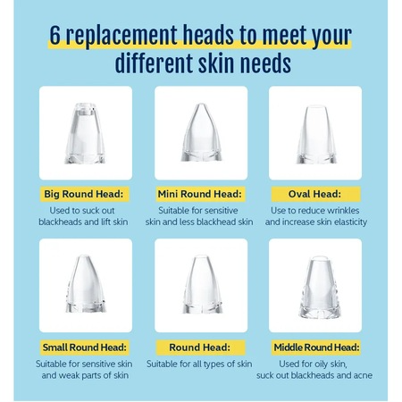 3. 6 Capete Detasabile: Cu 6 capete detasabile incluse, puteti alege capatul potrivit pentru a trata diferite probleme ale pielii, cum ar fi punctele negre, punctele de grasime, acneea sau exfolierea delicata.
