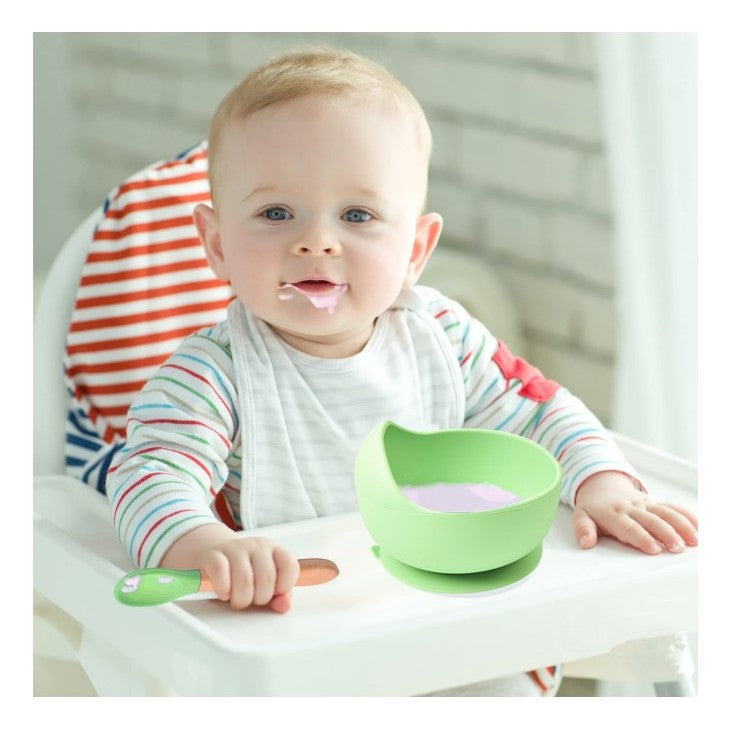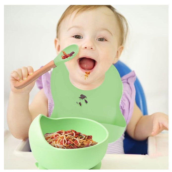 Set diversificare 10 piese din silicon și lemn – bol, farfurie, tacâmuri, cană cu ventuză, verde