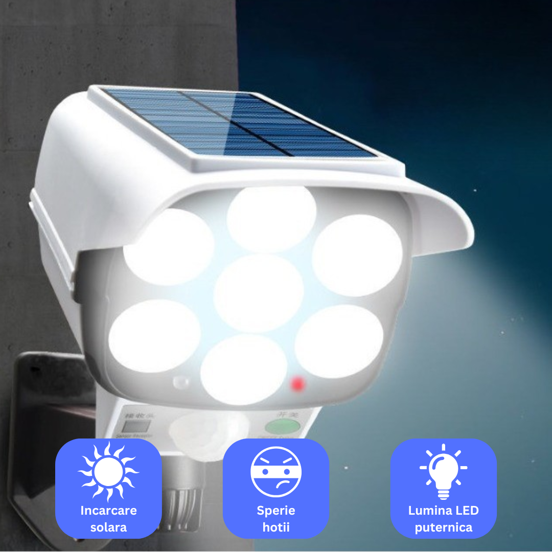 Oferă un plus de siguranță locuinței tale fără costuri suplimentare. Această cameră falsă imită perfect una reală, descurajând potențialii intruși. Cu 77 de LED-uri ultra-luminoase și un senzor de mișcare inteligent, se activează automat la detectarea mișcării, simulând prezența unui sistem de supraveghere activ. Încărcarea solară elimină necesitatea bateriilor sau a cablurilor, oferind o soluție eficientă și ecologică.